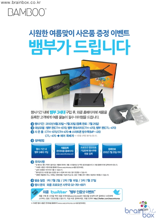 증정 - 6월 20일부터 오는 7월 20일까지 모든 Bamboo 3세대 시리즈 구매자 대상 세계적인 태블릿 전문 기업 와콤(Wacom)의 한국법인 한국와콤(대표 서석건)은 금일부터 오는 7월 20일까지 Bamboo 3세대 모델 구매고객 전원에게 여름철 물놀이 필수품을 증정하는 ‘시원한 여름맞이 사은품 증정 이벤트 Bamboo가 드립니다"를 진행한다. 이번 프로모션은 펜 태블릿에 멀티 터치와 무선 능력이 더해져 다양한 목적과 재미있는 컴퓨팅 경험을 제공하는 보급형 펜 태블릿 Bamboo 3세대(CTH-670, CTH-470, CTL-470)를 대상으로 진행된다. ![]() 와콤은 Bamboo 3세대 구매 후 와콤 홈페이지에 프로모션 쿠폰 번호를 등록하는 고객에게 여름 물놀이 필수 아이템을 선물한다. CTH-670과 CTH-470 모델 구매 고객에게는 스마트폰 방수팩(MP-i20), CTL-470 구매자에게는 에어 목 베개가 증정된다. 프로모션 쿠폰 번호 등록은 오는 7월 25일까지 한국와콤 홈페이지를 통해 할 수 있다. Bamboo 3세대 시리즈는 남녀노소 누구나 손쉽게 쓸 수 있는 보급형 펜 태블릿으로 손글씨, 메모, 드로잉, 스케칭, 게임, 사진 편집 등 다양한 디지털 콘텐츠를 만드는 데 활용된다. 세련미가 강조된 뱀부 태블릿 펜은 1,024 압력 감지 레벨을 지원하며, 고무타입으로 제작돼 편안한 그립감을 제공한다. 특히 무선 기술을 적용한 Bamboo 3세대는 이동성을 강화, 자유로운 동선에서 작업활동을 할 수 있도록 설계됐다. 이와 함께 와콤은 "와콤 트위터 Bamboo 3세대 인증샷 이벤트"를 진행하고 있다. 제품 구매 후, 제품 사진을 찍어 와콤 트위터(@wacomkorea)로 인증샷을 올린 참가자들에게는 음료 기프티콘이 증정된다. 성상희 한국와콤 부장은 “최근 본격적인 여름철을 맞아 즐겁게 휴가를 보낼 수 있는 엔터테인먼트가 주목되는 가운데, Bamboo 펜 태블릿은 여름방학 동안 창조적인 엔터테인먼트를 즐길 수 있는 최고의 아이템이 될 것”이라며 “특히 휴가철 야외에서 유용하게 활용할 수 있는 물놀이 필수품 증정 이벤트를 통해 고객 만족도를 높이고자 한다”고 말했다. 행사에 대한 보다 자세한 내용은 한국와콤 공식 홈페이지에서 확인할 수 있다. |