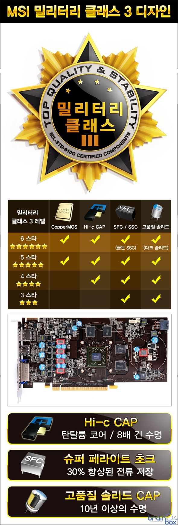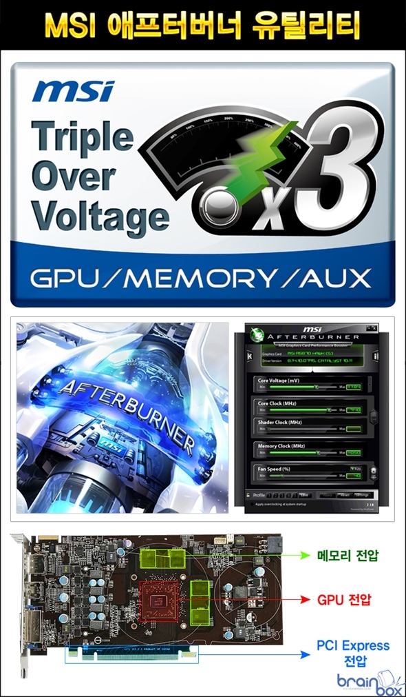 | - 효율적인 트랜스써멀 쿨링 시스템 - 파워 에디션 - 강력한 3+2 전원부 디자인 - MSI 밀리터리 클래스 3 디자인 채택 - MSI 애프터버너 유틸리티 ? 트리플 오버볼티지 및 쿰버스터 기능? 세계 최고의 VGA 제조 기술력을 갖춘, MSI의 한국 공식 디스트리뷰터인 ㈜웨이코스(대표:고민종)가 최신 MSI 트랜스써멀 쿨링 시스템을 갖춘 “MSI R7770 트랜스써멀 1GD5 파워 에디션/OC” 그래픽카드를 출시했다. ![]() MSI R7770 트랜스써멀 1GD5 파워 에디션/OC 그래픽카드는 MSI의 새로운 쿨링 시스템을 장착한 파워 에디션 제품으로 기존 레퍼런스 제품 대비 뛰어난 성능을 제공한다.? 효율적인 트랜스써멀 쿨링 시스템? ![]() MSI R7770 트랜스써멀 1GD5 파워 에디션/OC 그래픽카드는 일반 싱글 팬 제품들의 냉각 성능의 한계를 개선하여 싱글 팬에서 듀얼 팬으로 다시 더블 팬으로 쿨러를 변경할 수 있어 다양한 작업 환경에 최적화 시킬 수 있는 기능을 제공한다. 트랜스써멀 쿨링 시스템은 그래픽카드 기판을 모두 커버할 수 있는 구리 히트파이트가 장착된 대형 히트싱크에 90mm 프로펠러 브레이드 팬과 듀얼 팬을 구성할 수 있도록 확장 팬을 제공하고 있다. 기존 레퍼런스 싱글 팬 쿨링에 비해 낮은 소음과 13℃ 낮은 발열 온도를 제공하며, 듀얼 팬 쿨링으로 변경 시 18℃ 더 시원한 냉각 효율과 더블 팬 쿨링 시 더욱 높은 공기 압력을 이용하여 17℃ 더 시원한 풍량을 제공한다.? 또한, 그래픽카드 쿨링 시스템에 쌓인 먼지를 제거할 수 있도록 30초간 쿨러를 역회전 시키는 Dust Removal 기술을 통해 항상 최상의 냉각 효율을 유지할 수 있는 기능도 함께 제공한다.? 파워 에디션 ? 강력한 3+2 전원부 디자인 ![]() MSI R7770 트랜스써멀 1GD5 파워 에디션/OC는 그래픽카드의 전압을 조정할 수 있는 트리블 오버볼티지를 지원하며 그래픽카드의 한계치까지 오버클럭 성능을 발휘할 수 있도록 강화된 3+2 PWM 디자인을 채택하고 있다.? MSI 밀리터리 클래스 3 디자인 채택 ![]() MSI R7770 트랜스써멀 1GD5 파워 에디션/OC 그래픽카드는 더욱 우수한 품질을 제공하기 위하여, 밀리터리 클래스 3 디자인을 채택하였다. 탄탈륨 코어를 기반으로 일반 솔리드 캐패시터보다 8배 긴 수명과 낮은 ESR을 제공하는 Hi-c CAP과 기존 초크보다 30% 향상된 전류 저장능력 및 안정적인 전원을 공급할 수 있는 SFC(슈퍼 페라이트 초크) 그리고 10년 이상의 긴 수명을 제공하는 고품질 올 솔리드 캐패시터로 구성되어 더욱 강력하고 단단한 품질을 제공한다.? ※ 밀리터리 클래스 3 부품이 통과한 테스트 (MIL STD는 미 국방성 통과 기준) - 습도 테스트 (Humidity Test) : (MIL STD 810G Method 507.5) - 저압 테스트 (Low Pressure Test) : (MIL STD 810G Method 500.5) - 고온 테스트 (High Temperature Test) : (MIL STD 810G Method 501.5) - 저온 테스트 (Low Temperature Test) : (MIL STD 810G Method 502.5) - 온도 충격 테스트 (Temperature Shock Test) : (MIL STD 810G Method 503.5) - 진동 테스트 (Vibration Test) : (MIL STD 810G Method 514.6) - 충격 테스트 (Shock Test) : (MIL STD 810G Method 516.6) MSI 밀리터리 클래스 3 디자인에 속한 부품들은 우수한 품질과 내구성으로, IST (Integrated Service Technology) 그룹의 공식 인증서를 발급 받았다. IST 는 다양한 하드웨어 제품의 품질과 안전성을 테스트하는 전문 연구기관으로, 습도 / 고온(발열) / 충격 / 진동 등의 다양한 테스트를 미 국방성이 제시한 기준과 동일하게 진행하여 이를 통과한 제품 및 부품에 대해서 품질 인증서를 발급하게 된다. MSI 애프터버너 유틸리티 ? 트리플 오버볼티지 및 쿰버스터 기능 ![]() MSI R7770 트랜스써멀 1GD5 파워 에디션/OC 그래픽카드 사용자는 MSI 애프터버너 오버클러킹 유틸리티를 통해 직접 GPU와 메모리, PCI Express 공급 전압 및 클럭 조정 기능을 제공하여, 잠재된 그래픽카드 오버클럭 능력을 최대한 발휘할 수 있게 만들어 줄 수 있다. 게이머는 애프터버너 유틸리티 안에 포함된 프레데터(Predator) 기능을 통해 자신의 게임 플레이 화면을 실시간으로 동영상 캡쳐를 할 수 있어 더욱 다양한 방식으로 게임을 즐길 수 있으며, 애프터버너 앱을 사용할 경우 iOS와 안드로이드 기반의 모바일 기기를 통한 애프터버너 기능의 무선 원격 조정이 가능하여, 다양한 방식으로 VGA 오버클러킹 및 모니터링이 가능한 특징을 제공한다. ![]() 또한 애프터버너로 오버클럭을 한 뒤에, 안정적으로 동작하는 지 사용자가 직접 확인할 수 있는 “쿰버스터(Kombustor)” 유틸리티를 함께 제공하여, 최적의 OC 클럭을 찾아낼 수 있도록 지원하고 있다. MSI 공식 한국 디스트리뷰터인 ㈜웨이코스가 국내에 유통하는 MSI 그래픽카드는 타사 저가형 VGA 와 차별화된 3년 무상 A/S 를 제공하며, 더욱 자세한 내용은 웨이코스 홈페이지 (02-712-8999)을 참조하면 된다. ※