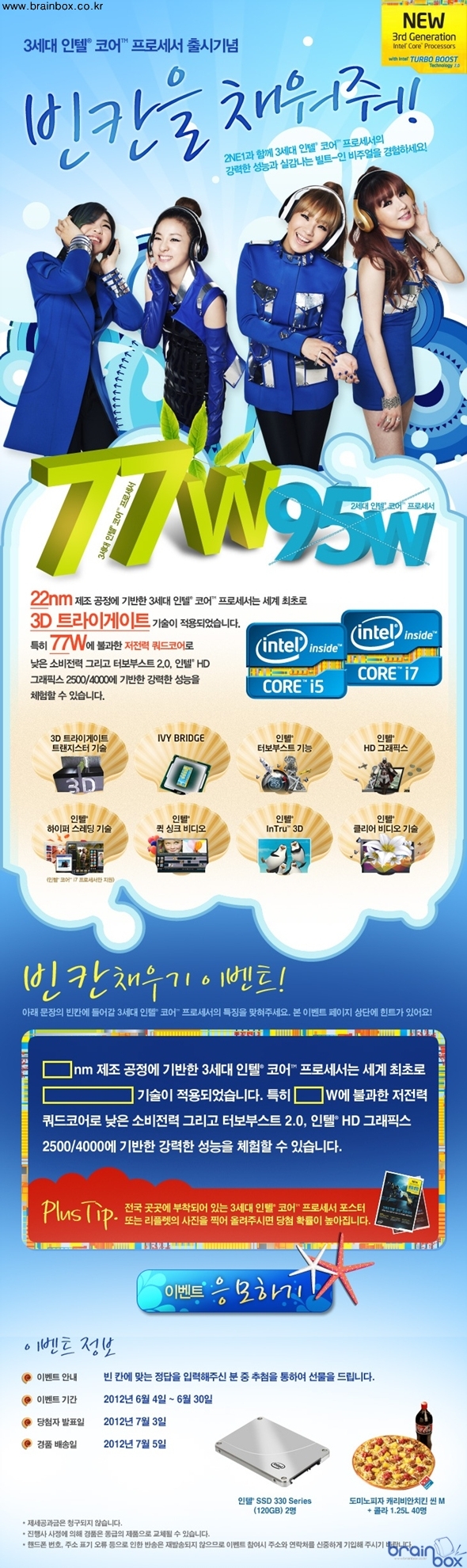 | - 초저전력과 고성능, 일거양득 이룬 3세대 인텔 코어 - 빈칸을 채우면... SSD, 피자 등 푸짐한 선물이! - 간단한 퀴즈로 한여름의 나른함을 훌훌 날린다 지난 4월 24일 공식 출시된 3세대 인텔 코어 프로세서가 전 세계 PC시장은 물론 대한민국에서도 CPU의 대세로 자리매김한 가운데, 3세대 인텔 코어 프로세서에 대한 간단한 상식을 알아보는 퀴즈 이벤트가 실시되어 화제다. 22nm 제조 공정에 기반한 3세대 인텔 코어 프로세서는 세계최초로 3D 트라이게이트 기술이 적용된 CPU. 특히 77W에 불과한 저전력 쿼드코어로 낮은 소비전력으로 사용할 수 있어 고성능과 저전력 두 마리 토끼를 잡기도 했다. 게다가 터보부스트 2.0, 인텔 HD 그래픽스 2500/4000 등에 기반한 강력한 성능도 자랑꺼리다. 이처럼 다재다능한 면모를 뽐내는 3세대 인텔 코어 프로세서는 같은 인텔의 SSD 330 시리즈와 만나 더욱 강력한 성능을 사용자의 PC에 제공한다. 장안의 화제인 ‘디아블로 3’는 물론, 정식 서비스가 임박한 ‘블레이드 앤 소울’에서 최상의 플레이 환경을 제공하는 이 둘의 조합은 이미 국내외 게이머들 사이에서 필승의 열쇠로 인정받고 있다. 3세대 인텔 코어 프로세서에 대한 간단한 상식을 알아보는 이번 퀴즈 이벤트에서는, 2명에게 최고의 궁합을 자랑하는 SATA3 6Gbps 규격 인텔 SSD 330 120GB 모델을 두 명에게 제공한다. 또한 도미노피자 캐리비안치킨 씬 M 콜라 1.25L 콤보세트를 40명에게 제공해 한여름을 더욱 상쾌하게 만들어줄 예정이다. 오는 6월 30일까지 진행되는 이번 이벤트는 이벤트 홈페이지에서 빈칸에 알맞은 말을 넣어 응모하면 된다. 오는 7월 3일 당첨자가 발표될 예정이며, 경품 배송일(예정)은 오는 7월 5일이다. ‘빈칸을 채워줘!’ 이벤트 담당자는 “22nm 제조공정과 3D 트라이게이트 기술로 제작된 3세대 인텔 코어 프로세서는 게이머는 물론 모든 PC 사용자 여러분들에게 최고의 컴퓨팅 경험을 안겨주는 제품입니다. 특히 77W에 불과한 저전력 특성은 최근의 전기절약운동에 당장 기여할 수 있다는 점에서 주목할만 합니다”라고 말하고, “3세대 인텔 코어 프로세서에 대한 간단한 상식을 다루는 이번 퀴즈 이벤트를 통해 한여름의 나른함을 떨칠 흥겨운 기회를 소비자 여러분들이 얻길 바랍니다”라고 바램을 밝혔다. ![]() |