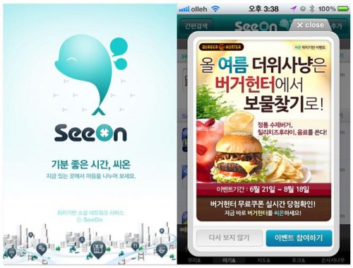 이번에 제휴한 아워홈의 수제버거브랜드 ‘버거헌터’는 씨온의 씨온샵에 6개 매장의 정보를 실시간으로 제공하며, 주변을 지나는 고객을 대상으로 타깃 마케팅을 펼칠 예정이다. 첫 제휴 기념으로 보물찾기 이벤트를 통해 8월 18일까지 씨온 애플리케이션에 뜬 버거헌터를 씨온(체크인)한 고객 500여 명에게 수제버거, 감자칩, 치즈포테이토, 스무디, 에이드 등 다양한 공짜 메뉴들을 제공한다. 또한 버거헌터 매장 방문 후 인증샷을 씨온에 올리면 선착순 100명에게 치즈버거 1인 쿠폰도 증정한다.