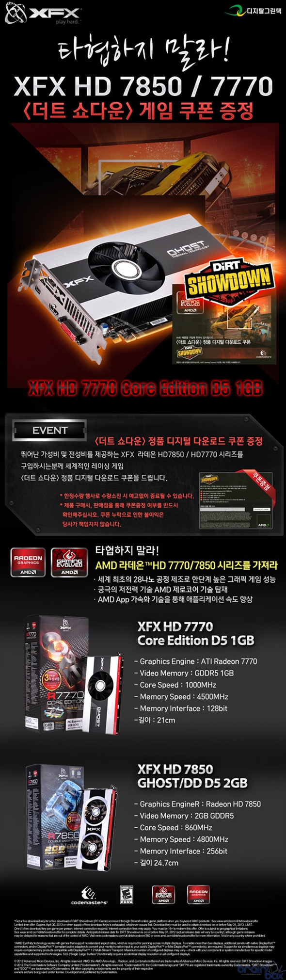 구입고객을 대상으로 정품 게임 쿠폰을 증정하는 특별 프로모션을 실시한다. 이번 프로모션을 통해 증정되는 게임은, [더트 3]를 개발한 레이싱게임의 명가 코드마스터에서 2012년 5월 24일 발표한 신작 [더트 쇼다운]이다. 이전작 [더트 3]에 비해 아케이드성과 짐카나 모드를 한층 발전시킨 [더트 쇼다운]은 더트시리즈에서는 처음으로 경쟁차량의 파괴할 수 있는 새로운 경주 이벤트, "디스트럭션 더비"를 추가했다. 또, 코드마스터 특유의 조작성과 안정된 컨트롤을 유지하는 한편, 이전 시리즈에 비해 한결 간결해진 조작성을 통해 초보자도 쉽게 레이싱의 즐거움을 느낄 수 있도록 한 것이 특징이다. ![]() 한정수량으로 진행되는 이번 [더트 쇼다운] 증정행사는, [XFX HD7850 D5 2GB Ghost/DD]와 [XFX HD7770 D5 1GB Core Edition]을 구입하는 고객을 대상으로 제품패키지 내에 게임쿠폰을 함께 제공하며, 동봉된 쿠폰코드를 스팀에 등록하면 정품과 동일한 다운로드 및 게임 플레이가 가능하다. . 디지탈그린텍㈜ 마케팅 담당자는 "XFX의 HD7850 / HD7770 은 AMD 그래픽코어의 뛰어난 전력소모량 대비 성능 외에도, 그래픽카드의 발열을 신속히 외부로 발산하는 XFX 고유의 "고스트 서멀 테크놀러지"와 팬 내부의 먼지유입을 막아 최대 10,000시간의 수명을 자랑하는 "Dust-Proof Fan" 과 같은 부가기능을 더해, 상품성을 극대화 한 제품" 이며, "스팀을 통해 49달러가 넘는 가격에 판매되는 [더트 쇼다운]을 함께 제공하는 이번 행사는 AMD의 고성능 그래픽카드와 인기 레이싱 게임을 한번에 가질 수 있는 좋은 기회가 될 것"으로 전망했다. [더트 쇼다운] 게임쿠폰 증정행사는 6월 21일부터 시작되며, 행사에 대한 자세한 문의는 디지탈그린텍㈜ 영업부 (02-715-9327)를 통해 가능하다. |