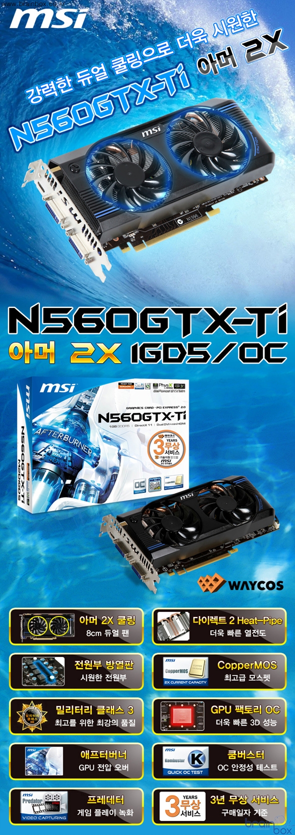 ![]() MSI 공식 한국 디스트리뷰터인 ㈜웨이코스가 국내에 유통하는 MSI 그래픽카드는 타사 저가형 VGA 와 차별화된 3년 무상 A/S 를 제공하며, 더욱 자세한 내용은 웨이코스 홈페이지를 참조하면 된다. |