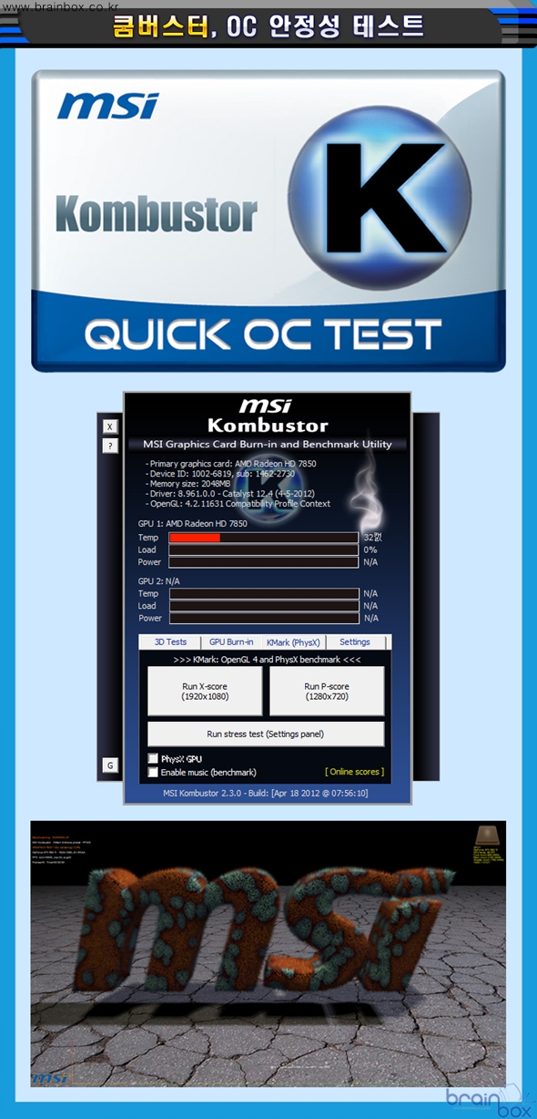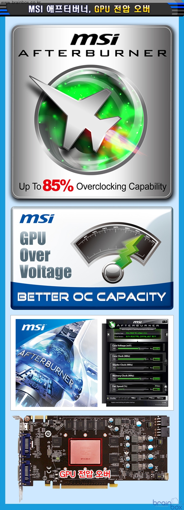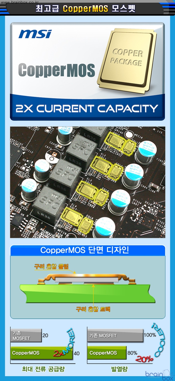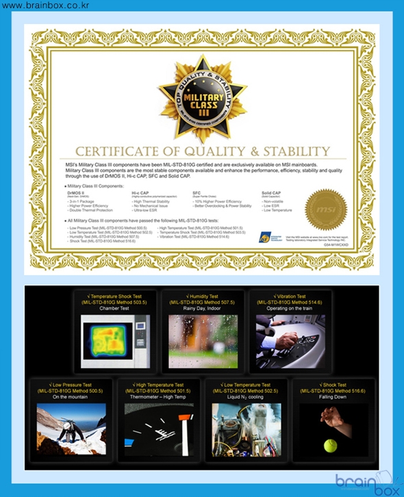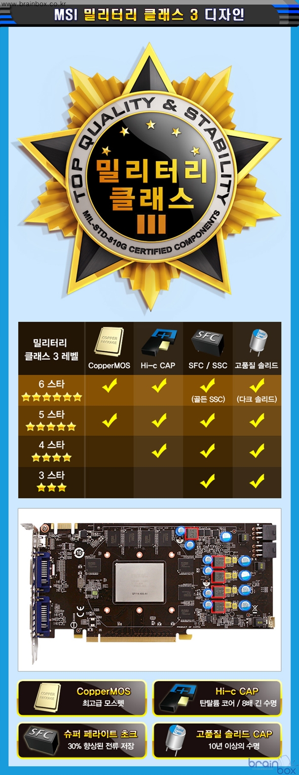출시했다. ![]() MSI 아머 2X 쿨링 시스템 ![]() MSI N560GTX-TI 아머 2X 1GD5/OC 제품은 레퍼런스 제품보다 더욱 강화된 쿨링 성능을 제공하는 “아머 2X” 쿨링 시스템을 장착한 제품이다. 아머 2X 쿨링 시스템은 MSI가 자체 개발한 고유의 쿨링 솔루션으로서, 8cm 듀얼 팬을 장착하여 NVIDIA 레퍼런스 쿨러보다 더 시원한 특성을 제공한다. MSI 아머 2X 쿨링 시스템은 GPU의 발열량을 신속하게 제거하기 위하여, 2개의 “다이렉트 2 Heat-Pipe”를 기본으로 제공하고 있다. 다이렉트 2 Heat-Pipe는 GPU의 발열량을 빠르고 신속하게 방열핀으로 제공하기 위해, 구리 히트파이프가 GPU에 직접 밀착되는 디자인으로 제조 되었다. MSI N560GTX-Ti 아머 2X 1GD5/OC 제품은 전원부의 발열량을 흡수하여 제거하는 “전원부 히트싱크”를 장착하여, 오버클러킹 환경에서도 안정적인 전원부 동작을 보장한다. ![]() 최고급 CopperMOS 모스펫 ![]() MSI N560GTX-Ti 아머 2X 1GD5/OC 제품은 더욱 우수한 전원부 품질을 제공하기 위해 “최고급 CopperMOS 모스펫”을 장착한 제품이다. CopperMOS 모스펫은 패키징 자체에 구리 성분을 포함하고 있고, 더블 사이드 (양쪽면) 쿨링으로 일반 모스펫보다 발열량은 20% 줄어들고 최대 전류 공급량은 2배로 늘어난 탁월한 품질을 제공한다. ![]() MSI 밀리터리 클래스 3 디자인 ![]() MSI N560GTX-TI 아머 2X 1GD5/OC 제품은 더욱 우수한 품질을 제공하기 위하여, 밀리터리 클래스 3 디자인을 적용하였다. 본 제품에 장착된 Hi-c 캐패시터는 탄탈륨 코어를 기반으로 일반 솔리드 캐패시터보다 8배 긴 수명과 고온에서도 높은 안정성을 제공하는 특성을 제공하며, SFC (슈퍼 페라이트 초크) 는 기존 초크보다 30% 향상된 전류 저장능력 및 오버클러킹 환경에서도 안정적인 전원을 공급할 수 있는 특징을 제공한다. 아울러 전체 기판에 사용된 고품질 솔리드 캐패시터는 풀로드 상태를 기준으로 10년이라는 긴 수명을 제공하여, ESR 특성 부분에서도 기존 솔리드 캐패시터보다 30% 낮은 특성을 제공한다. ![]() ※ 밀리터리 클래스 3 부품이 통과한 테스트 (MIL STD는 미 국방성 통과 기준) - 습도 테스트 (Humidity Test) : (MIL STD 810G Method 507.5) - 저압 테스트 (Low Pressure Test) : (MIL STD 810G Method 500.5) - 고온 테스트 (High Temperature Test) : (MIL STD 810G Method 501.5) - 저온 테스트 (Low Temperature Test) : (MIL STD 810G Method 502.5) - 온도 충격 테스트 (Temperature Shock Test) : (MIL STD 810G Method 503.5) - 진동 테스트 (Vibration Test) : (MIL STD 810G Method 514.6) - 충격 테스트 (Shock Test) : (MIL STD 810G Method 516.6) MSI 밀리터리 클래스 3 디자인에 속한 부품들은 우수한 품질과 내구성으로, IST (Integrated Service Technology) 그룹의 공식 인증서를 발급 받았다. IST 는 다양한 하드웨어 제품의 품질과 안전성을 테스트하는 전문 연구기관으로, 습도 / 고온(발열) / 충격 / 진동 등의 다양한 테스트를 미 국방성이 제시한 기준과 동일하게 진행하여 이를 통과한 제품 및 부품에 대해서 품질 인증서를 발급하게 된다. 팩토리 OC로 더욱 빠르게 ![]() MSI N560GTX-TI 아머 2X 1GD5/OC 제품은, 더욱 빠른 3D 가속 성능을 제공할 수 있도록 GPU 클럭이 832MHz로 더욱 상승되었다. 이로써 레퍼런스 제품보다 좀더 빠르고 부드럽게 3D 게임을 즐길 수 있는 매력을 제공한다. GPU 전압 오버 지원 ![]() MSI N560GTX-TI 아머 2X 1GD5/OC 제품은 MSI 애프터버너 유틸리티를 기본 제공하여, 그래픽 카드로 더욱 높은 성능향상을 꿈꾸는 사용자 계층에게 편리한 기능성을 제공한다. MSI 애프터버너는 세계적으로 유명한 VGA 오버클럭 & 튜닝 유틸리티인 “Riva Turner” 와 공식 라이센스 계약을 체결하고 함께 개발한 VGA 튜닝 유틸리티로서, 최신 MSI 그래픽 카드 패키지에 포함되어 있는 VGA 튜닝 유틸리티다. MSI 애프터버너 유틸리티를 통해 사용자는 GPU 클럭 / 메모리 클럭 / 팬 스피드 등을 자유롭게 조절할 수 있으며, MSI 그래픽 카드의 현재 동작 환경에 대한 자세한 정보(모니터링 기능)도 얻을 수 있다. 특히 MSI N560GTX-TI 아머 2X 1GD5/OC 제품은 MSI 애프터버너 유틸리티를 통하여 GPU 공급 전압을 조절할 수 있는 기능을 제공하여, 오버클럭 매니아 계층에게도 어필할 수 있는 강력한 OC 기능을 제공한다. 쿰버스터 OC 안정성 테스트 ![]() MSI N560GTX-TI 아머 2X 1GD5/OC 제품은 MSI 애프터버너 유틸리티로 오버클럭을 한 뒤, 안정적으로 동작하는 지 사용자가 직접 확인할 수 있는 “쿰버스터(Kombustor)” 유틸리티를 함께 제공하여 최적의 OC 클럭을 찾아낼 수 있도록 지원하고 있다. (DirectX 11 공식 지원) 프레데터 게임 플레이 녹화 ![]() MSI N560GTX-TI 아머 2X 1GD5/OC 제품은 사용자의 게임 실력을 향상시킬 수 있도록 특별한 기능을 제공한다. MSI 애프터버너 유틸리티 안에 포함되어 있는 “프레데터” 기능을 통해, 게이머는 자신의 게임 플레이 화면를 비디오로 녹화할 수 있다. 녹화된 비디오 시청을 통해 사용자는 자신의 게임 플레이 스타일을 객관적으로 분석하고 장단점을 파악하여 게임 플레이 실력을 향상시킬 수 있다. ※