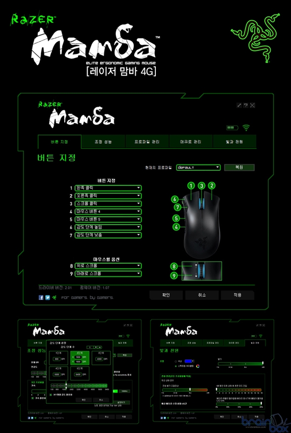 Razer Mamba 4G 제품에는 전용 드라이버가 제공되어 게임에 따라 세팅 값을 달리하여 최적의 게이밍 환경을 구성할 수 있다. dpi와 폴링 레이트 설정이 가능하며 게이머의 특성에 따라 X/Y 값을 개별적으로 적용할 수 있다. dpi 설정은 100 ~ 5600 dpi 사이에서 원하는 값으로 자유롭게 세팅이 가능하며, 폴링 레이트는 125 / 500 / 1000 polling 으로 설정이 가능하다. 또한 설정한 값을 5단계로 프로파일화 하여 게임 환경 및 게이머의 편의에 따라서 손쉽게 dpi 변경이 가능하다.