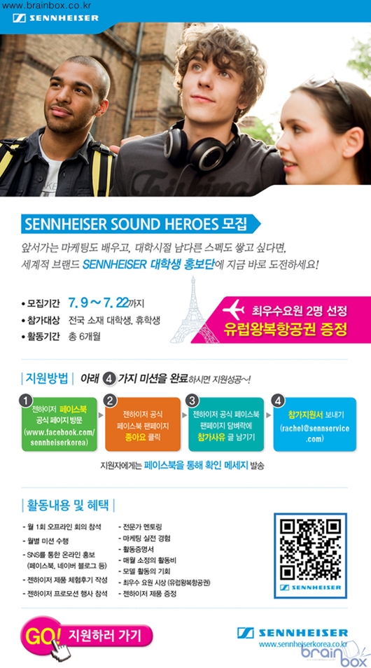 "젠하이저 사운드 히어로즈"는 젠하이저 제품과 마케팅에 관심이 있는 국내 대학생이면 누구나 지원 가능하다. 젠하이저 공식 페이스북 팬 페이지에 "좋아요"를 클릭한 후, 담벼락에 메시지, 사진, 비디오 등을 통해 홍보단에 지원하는 이유를 남기고 담당자에게 참가지원서를 보내면 된다. 참가신청서는 젠하이저 코리아 공식 홈페이지에서 다운로드 받을 수 있다. ‘젠하이저 사운드 히어로즈’ 모집인원은 총 10명(남자 5명, 여자 5명)이며, 오는 23일 1차 서류전형 발표 및 면접 등 소정의 과정을 거쳐 오는 8월 4일 최종 선발자 발표를 시작으로 약 6개월 간 젠하이저의 대학생 홍보대사로서 활동하게 된다. 발대식은 오는 8월 10일이다. 향후 ‘젠하이저 사운드 히어로즈’는 온?오프라인 활동을 병행하며 다양한 마케팅 기획 및 홍보, 영상물 제작에 참여하게 된다. 월 1회 이상의 정기 미팅을 통해 젠하이저 제품 및 회사 관련 교육을 받게 되며, 젠하이저 행사 참여는 물론 매달 색다른 월별 미션을 수행하면서 다양한 홍보 및 마케팅 활동을 직접 수행하게 된다. 특히, ‘젠하이저 사운드 히어로즈’에게는 팀별 활동을 통해 젠하이저 제품의 정식 모델로 활동할 수 있는 기회도 주워진다. 다양한 촬영 컨셉을 학생들이 직접 기획 취재하고, 제품을 착용한 스트릿 모델이 돼 촬영을 진행하는 등 홍보물 영상 제작 활동도 펼치게 된다. 또한 대학생 홍보단 수료자에 한해 활동 기간 동안 소정의 활동비, 젠하이저 아시아가 발행하는 활동 증명서, 젠하이저 제품(헤드폰과 이어폰), 기념품 등이 지급된다. 또 우수 활동자 2명에게는 배낭 여행 유럽 왕복 비행기 티켓이 시상될 계획이다. 마틴 로우 (Martin Low) 젠하이저 아시아 컨수머 비즈니스 총괄 부사장은 "이번 기회를 통해 대학생들의 신선한 아이디어를 적극적으로 반영해 젠하이저의 프리미엄 사운드를 알리고, 대학생들의 꿈을 적극적으로 지원할 계획"이라며 "젠하이저와 마케팅에 관심이 많은 개성 있고 활동적인 대학생들의 많은 참여를 기대한다“고 말했다. |