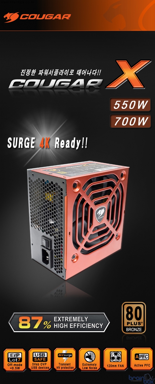 한국법인 에이치이씨코리아(대표 서동부)는 오랜 준비기간에 걸쳐 야심차게 탄생된 COUGAR X 시리즈 파워서플라이중 550W 와 700W를 출시했다. 근래에 들어 COUGAR 사는 Passion X Innovation(열정 X 혁신)이라는 브랜드 철학을 내세워 새로운 신제품들이 대거 출시되고있는 가운데,국내에도 역시 이에 걸맞는 제품을 국낸 유저의 눈높이에 맞추어 창조적인 파워서플라이를 제공하기위해,국내 최고의 엔지니어들에 의해 직접 재설계된 COUGAR X를 선보이게 되었다. 최대 87%의 고효율을 자랑하는 COUGAR X 는 기본적으로 파워서플라이가 가져야하는 기본적인 부분부터 새롭게 설계되었다. 단순히 출력포인트에서 나오는 결과성의 파워서플라이 이기이전에, 안정적인 구동과 보호를 중점으로 만들어진 파워라 하겠다.