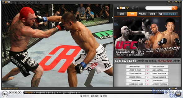 on FUEL4’ 생중계 - 미들급 빅매치로 격투기 팬들의 관심 집중 - 곰TV, 21일 캐나다 캘거리 스코티아뱅크 새들돔에서 개최되는 ‘UFC 149’ 생중계 예정 ㈜그래텍(대표 배인식)이 운영하는 곰TV는 오는 7월 12일 목요일 오전 8시 50분(이하 한국시간)에 미국 캘리포니아주 산호세 HP파빌리온센터에서 개최되는 ‘UFC on FUEL4’를 생중계한다. 이번 대회는 ‘필리핀 폭격기’ 마크 무노즈(34, 미국)와 ‘무패의 신성’ 크리스 와이드먼(34, 미국)의 경기를 메인 이벤트로 개최한다. 4연승의 무노즈와 8연승의 무패를 기록 중인 신예 와이드먼의 미들급 빅매치로 레슬링에 강점을 둔 두 선수가 어떤 기술을 선보일지 그 결과에 귀추가 주목된다. ![]() 이번 대회는 곰TV와 곰TV 채널 345번을 통해 생중계 되며, 곰TV는 지난 UFC 경기와 함께 격투 리얼리티 서바이벌 프로그램인 TUF 영상도 무료로 제공한다. 또한 UFC 동영상 다시보기는 곰TV PC와 곰TV 모바일 앱을 통해서도 시청 가능하다. 남윤철 ㈜그래텍 곰TV 서비스운영실장은 “곰TV는 내일 치러지는 ‘UFC on FUEL4’를 생중계하게 되어 매우 기쁘게 생각한다. 이번 대회를 통해 상승세인 마크 무노즈와 주목 받는 신예 크리스 와이드먼이 펼치는 미들급 빅매치를 감상하길 바란다. 이번 경기 시청과 함께 무더위 속 시원한 하루를 보낼 수 있을 것이다” 한편 곰TV는 오는 7월 21일 일요일 캐나다 캘거리 스코티아뱅크 새들돔에서에서 개최되는 ‘UFC 149’를 생중계 한다. ‘UFC 149’에서 페더급 타이틀 매치를 치를 예정이었던 조제 알도(25, 브라질)는 부상으로 결장을 선언했다. |