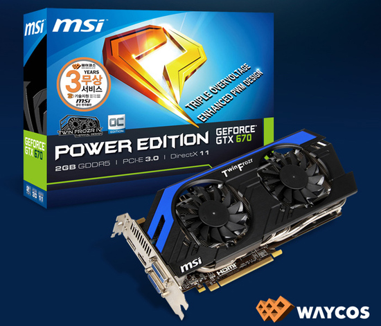 웨이코스(대표 고민종)는 NVIDIA 지포스 GTX 670 GPU를 장착한 그래픽카드 'MSI N670GTX