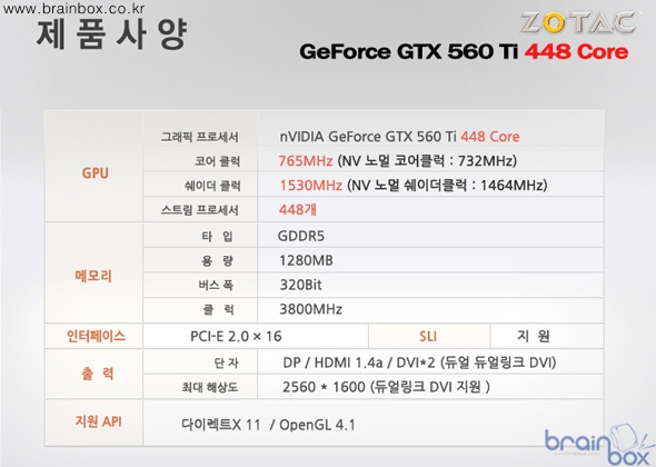 GTX570 급 성능을 가진 그래픽카드, “ZOTAC 지포스 GTX560 Ti 448 코어” 그래픽카드와 메인보드, 미니PC의 세계적인 제조사인 조텍(대표이사 김성표)에서 448개의 CUDA 코어를 가진 GTX560Ti 그래픽프로세서를 장착한 “지포스 GTX560Ti 448코어 리미티드 에디션”을 출시하였다. “ZOTAC 지포스 GTX560Ti 448코어 리미티드 에디션” 은 일반적인 GTX 560 Ti 그래픽프로세서가 아닌 (384개의 CUDA 코어와 256bit 의 메모리인터페이스를 가진), GTX 570과 GTX 580에 쓰인 GF110 다이를 기반으로 만들어진 GTX560 Ti (448코어) 를 장착한 것이 특징이다. 또한 GTX570 과 동일한 320bit 의 메모리 인터페이스를 가지며, 이러한 특징들로 인하여 조텍의 “지포스 GTX 560 Ti 448코어 리미티드 에디션” 은 상위기종인 GeForce GTX 570과 클럭스피드의 차이만 날뿐 동급의 엔진을 갖추고 있다고 할 수 있다.
