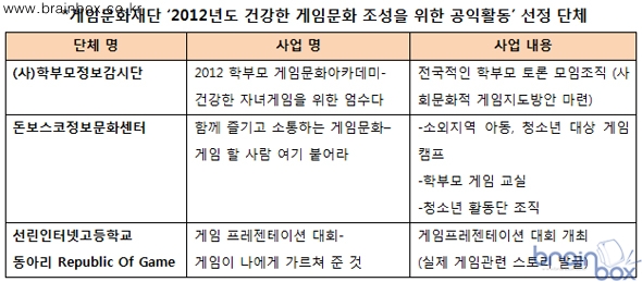 게임문화재단(이사장 김종민)이 ‘2012년도 건강한 게임문화 조성을 위한 공익활동’ 공모를 진행한 결과 (
