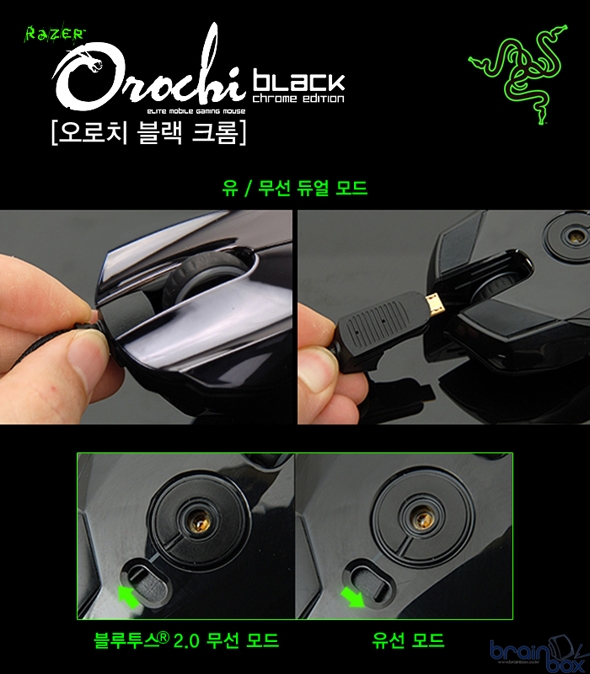 Razer Orochi 마우스는 노트북 및 휴대용 넷북을 애용하는 사용자를 위해 블루투스 무선 기술을 지원하는 모바일 게이밍 마우스다. Bluetooth 2.0 무선과 유선 방식 모두 지원하는 듀얼 모드를 갖추고 있으며, 일반 광센서의 5배 이상의 정밀한 4000 dpi 3G 레이져 센서를 장착한 제품이다. Razer Orochi Black 크롬 모바일 마우스는 유저 환경에 따라 무선/유선을 선택적으로 사용할 수 있는 듀얼 모드 기능을 갖추고 있다. 마우스에 연결된 케이블을 탈착 후 바닥면의 위치한 전원 스위치를 On 시키면 바로 블루투스 무선 모드로 사용이 가능하다. 무선 모드 이용 시 AA 건전지 2개를 장착하여 사용 가능하며 무선 Off 스위치 기능을 통해 효율적인 배터리 관리를 할 수 있다. 유선 모드로 사용 시 제공된 USB케이블을 마우스 앞부분 포트에 연결하면 지연 없이 바로 사용할 수 있어 블루투스를 지원하지 않는 모바일 기기에서도 쓸 수 있는 장점을 제공한다. Razer Orochi Black 크롬 모바일 마우스는 모든 유저가 보다 편하게 사용할 수 있도록 양손잡이 형태의 인체공학적 디자인을 반영하여 편안한 그립감과 클릭감을 제공한다. 모바일 마우스에 적합한 사이즈를 갖추고 있어 손이 작은 사용자도 편하게 사용할 수 있다. 기존 Razer 게이밍 마우스들보다 높이나 길이가 작아진 컴팩트한 사이즈로 이동이 잦은 사용자를 위해 전용 파우치도 함께 제공한다.
