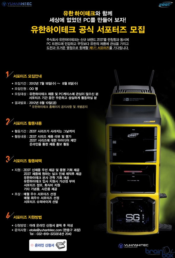 국내 컴퓨터 케이스 전문 제조업체인 유한하이테크(대표:한주현)는 국내 마케팅 활동 참여 프로그램으로 자사 제스트(ZEST) 브랜드의 공식 서포터즈 1기를 7월 18일부터 8월 8일까지 모집하기로 하고 온라인 지원 접수를 시작했다.