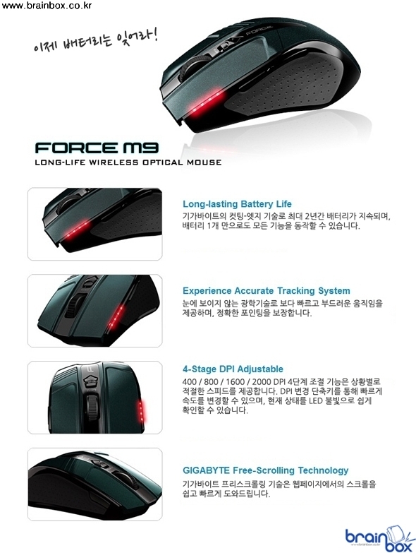 기가바이트 FORCE M9 마우스는 배터리 한번 삽입으로 최대 2년간 지속되는 저전력 소모 무선마우스다. 보통의 무선 마우스의 배터리가 3개월 내외임을 감안하면 얼마나 전력효율이 좋은지를 짐작할 수 있다. 최대 2000 DPI 해상도로 동작하는 광학 센서는 단계별 조절이 가능하며 부드럽고 빠른 움직임을 제공한다. 그리고 기가바이트의 프리스크롤링 기술은 웹페이지 검색시 편의성을 제공하며, Turquoise Green 컬러의 반짝이는 외형은 시각적인 만족까지 제공한다. |