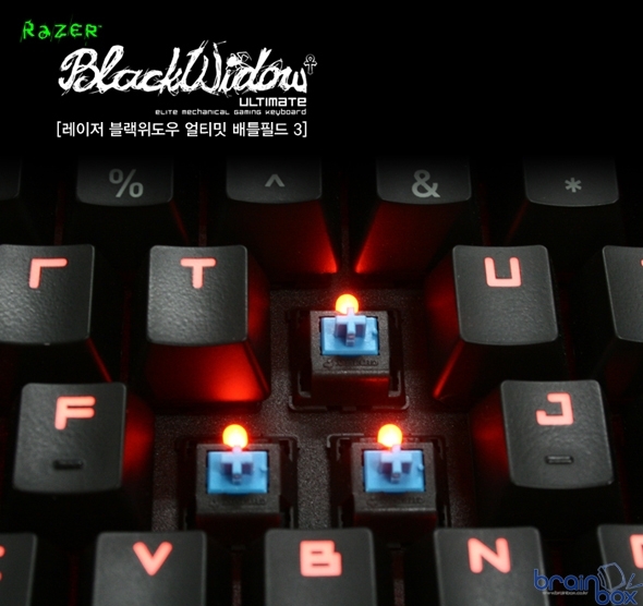 전세계 게이머들의 위해 Razer 디자인팀과 기술팀이 3년의 연구/개발을 통해 만들어진 제품으로 게이밍에 최적화된 기능과 성능을 갖추고 있는 기계식 키보드 제품으로 배틀필드 3 에디션 제품을 출시되어 마니아들의 많은 관심을 받고 있다. Razer Blackwidow Ultimate Battlefield 3 키보드는 배틀필드 3 스킨을 적용한 디자인을 채택한 게이밍 키보드로서 모든 입력 값에 직각적인 피드백을 전달하는 기계식 키를 적용한 제품이다. 블랙위도우 얼티밋 제품에는 독일 체리사의 MX 청축이 사용되어 기계식 키보드에 느낄 수 있는 최고의 키 감을 제공한다. 또한 게임 플레이 시 빠르고 정확한 컨트롤을 제공하기 위해 1,000MHz 울트라폴링 데이터 전송속도를 지원하며, 0.001초에 해당되는 1ms 응답속도를 제공한다. Razer Blackwidow Ultimate Battlefield 3 키보드 좌측에는 매크로 전용 5키가 위치해 있어 전용 프로그램을 통한 매크로 세팅 후 게임 플레이 시 게이머의 맞게 실시간으로 변환 시킬 수 있으며, 최대 10 프로필을 드라이버 메뉴를 거치지 않고 무제한 매크로를 기록할 수 있는 기능을 제공하며, 게임 시에는 매크로 패드로 평상시에는 일반 기능키 패드로 사용할 수 있다. Razer Blackwidow Ultimate Battlefield 3 는 다양한 기능키 및 확장 등 편의성을 갖추고 있어 게이머에게 최적의 게이밍 환경을 제공한다. 블랙위도우 얼티밋 제품은 게이밍 모드 옵션 키(F11)를 적용하여 윈도우키 버튼 입력을 차단하여 게임 플레이 시 불편을 방지해 주며, 하단의 ATL키는 매크로 기능을 적용 할 수 있는 Fn키로 쓰이며 적용 여부는 우측 상단의 LED로 확인이 가능하다. Battlefield 에디션 제품은 개별 LED 라이트닝 조명 기능을 제공하며 기존 블랙위도우 얼티밋과 차별되도록 매력적인 붉은 오렌지 빛 LED 조명을 갖추고 조명 밝기도 5단계로 조절할 수 있다. 키보드 우측 면에는 USB 허브와 오디오/마이크 단자가 탑재되어 있어 게이머들의 편의성을 최대한 고려하였다. |