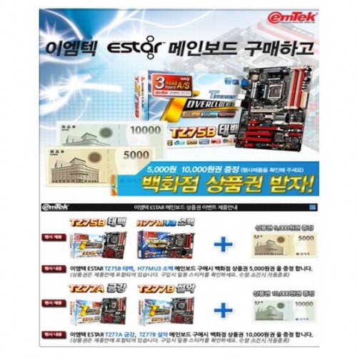 이번 판촉 행사는 이엠텍아이엔씨에서 유통하고 있는 인텔 3세대 코어 프로세서용 ESTAR 메인보드 시리즈 중 높은 가격대 성능비로 호평을 받고 있는 TZ77A 금강, TZ77B 설악, TZ75B 태백, H77MU3 소백 제품을 대상으로 펼쳐지며, 제품에 따라 10,000원권 또는 5,000원권 신세계 백화점 상품권이 7,777장 한정수량으로 제품 패키지에 동봉되어 판매된다.