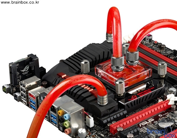 ASUS ROG Maximus V Formula 마더보드는 게이머와 오버클러커를 겨냥한 ASUS만의 차별화된 제품으로, 현재 출시된 마더보드 중 최초로 퓨전 써모 기술을 탑재했다. 현재 특허 출원 중인 퓨전 써모 기술은 스위프텍 (Swiftech®), EKWB 등 세계 우수 수냉식 쿨러 제조업체 10곳으로부터 공식 인증을 획득했으며, 게임, 오버클러킹 및 케이스 튜닝을 수행할 수 있는 유연성과 효율성을 제공한다. ASUS Fusion Thermo™ 기술 특허 출원 중 퓨전 써모의 가장 핵심적인 특징은 바로 하이브리드 디자인으로, 히트싱크 내부와 히트파이프 주변으로 구리 소재의 워터 채널을 내장했다. 이로 인해 수냉식 쿨링과 동일한 수준의 공냉식 쿨링 효율을 달성했으며, 사용자들은 효율적인 열 처리와 유연성을 을 모두 만족시키는 구성을 만들 수 있게 되었다. 또한 퓨전 써모의 양쪽 끝에는 전기도금한 고리를 장착해 수냉식 쿨링 설정 시 하드웨어 튜닝을 최소화하고 보다 간단하게 설치할 수 있다.