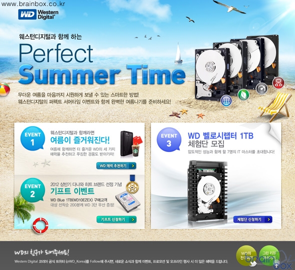 웨스턴디지털은 본격적인 여름 휴가철을 맞이하는 고객들에게 다양한 혜택을 제공하기 위해 ‘WD와 함께하는 퍼펙트 섬머 타임’ 프로모션을 진행합니다. 이번 프로모션은 ‘여름이 즐거워지는 WD의 세가지 매력’ 페이스북 댓글 달기 이벤트와 ‘WD 벨로시랩터 체험단 모집’ 이벤트, 그리고 구매 고객을 대상으로 한 ‘기프트 이벤트’등 세가지 이벤트로 구성되어 있는 다채로운 이벤트로서 해당 이벤트에 대한 자세한 내용은 아래와 같습니다. ‘여름이 즐거워지는 WD의 세가지 매력 이벤트’: 오늘부터 8월 21일까지 진행되는 ‘여름이 즐거워지는 WD의 세가지 매력 이벤트’는 ‘WD와 보내는 안전한 여름’, ‘WD와 즐기는 재미있는 여름’, ‘WD와 함께하는 편안한 여름’ 중 가장 마음에 드는 ‘매력적인 여름’을 추천하는 방식으로 진행됩니다. 페이스북 로그인 후 댓글로 추천 이유를 달면 응모가 완료되며, 추첨을 통해 당첨자들에게 WD My passport 1TB & 캐리비안베이 이용권(1인 2매), WD Black 1TB & 캐리비안베이 이용권 (1인 2매), CGV 3D 영화예매권 (1인 2매), 스타벅스 아이스 아메리카노 기프티콘을 선물을 드립니다.