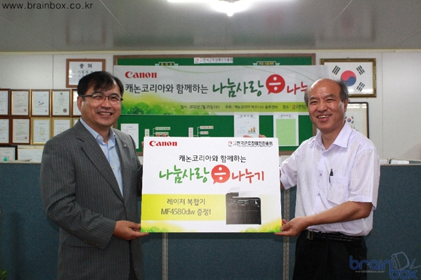 캐논코리아 비즈니스 솔루션(대표이사 김천주)은 지난 25일 인천시 서구 당하동에서 “캐논코리아와 함께하는 나눔사랑÷(나누기)” 기부식을 진행하였다. 지난해부터 실시된 “캐논코리아와 함께하는 나눔사랑÷(나누기)” 캠페인은 캐논 프린팅 공식 커뮤니티에 장애인 고용 기업 또는 장애인 관련 단체의 행복한 사연을 응모하면, 1개 기업/단체를 선정해 캐논 레이저 복합기 ‘MF4580dw’를 증정하는 이벤트이며, 두 번째 주인공으로 ‘(사단)한국근로장애인진흥회’가 선정되었다.. 한국근로장애인진흥회는 2010년 4월에 설립된 한국근로장애인진흥회는 복사용지, 중질지 등 지류를 생산하는 공장의 근로자 중 70%가 장애인으로 구성된 사단법인이다.