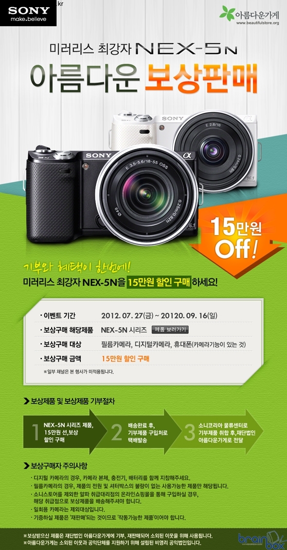 - NEX-5N 구입 시 15만원 보상 할인 적용, 제품 구매시 또는 구매 후 중고 카메라 기증 소니코리아(대표 이토키 기미히로)는 오는 9월 23일까지 국내외 소외된 이웃을 지원하는 비영리 공익단체 ‘아름다운가게’와 함께 중고 카메라 보상판매 행사 “아름다운 보상판매 이벤트”를 실시한다고 27일 밝혔다.