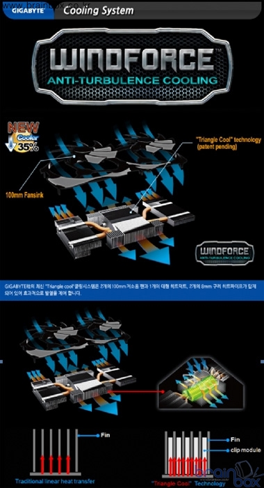 GIGABYTE GeForce® GTX670WF2 제품은 이미 그 성능과 내구성으로 인정받은 WINDFORCE-2X 쿨링 솔루션이 적용되어 고-풍량 100mm Dual Fan과 8mm 구리 히트파이프 2개가 장착되어 있다. 여기에 GIGABYTE High-End 제품군에만 적용되는 “Triangle Cool” , “Dircet Touch” 히트싱크 디자인이 접목되어 있어 효과적인 발열 제어를 가능케 한다. 이 제품의 또 다른 특징은 GIGABYTE社가 자랑하는 2oz Ultra Durable VGA(이하:UDV) 설계기술로 디자인 되어 일반 PCB에 비해 2배의 구리 Layer를 함유, 시스템의 안정성을 최우선으로 고려하고 있다. 또한 최고 품질로 인정 받은 일본산 Solid 캐패시터 및 Low RDS MOSFET 을 사용함으로써 더 나은 전기적 특성을 가지고 있으며 효율적인 전력 분배를 통해 전류의 흐름을 원활하게 제공한다. |