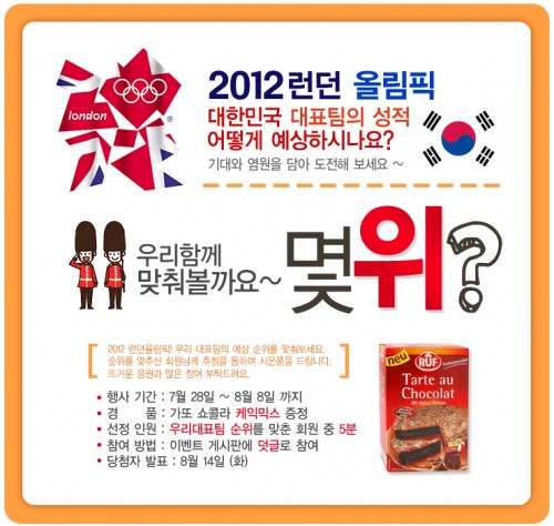 이번 이벤트는 올림픽이 폐막하기 4일 전인 8월 8일까지 LG 디오스 광파오븐의 요리커뮤니티인 ‘오븐&더레시피(cafe.naver.com/ovenwon)’에서 진행된다. 올림픽 이벤트 게시판에 대표팀 응원문구와 함께 예상 최종 순위를 덧글로 달면 응모 할 수 있다. 응모 결과는 8월 14일에 발표되며, 추첨을 통해 정확한 순위를 맞힌 5명에게 가또 쇼콜라 케익믹스를 증정한다.