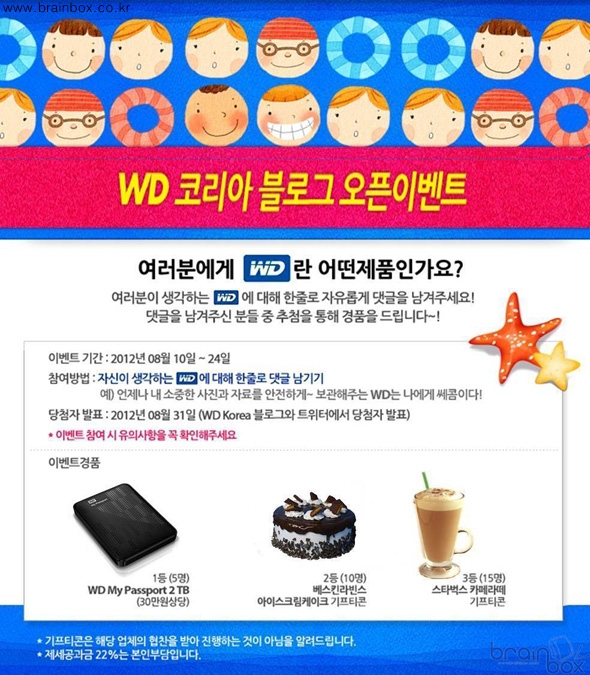 WD 공식 블로그 오픈 기념 이벤트 ‘나에게 WD란?’: WD는 공식 블로그 오픈을 기념해 오는 24일까지 이벤트를 진행한다. ‘나에게 WD란?’ 이란 제목으로 진행되는 이번 오픈 이벤트는 WD에 대한 고객들의 진솔한 생각을 듣고 소통하고자 하는 의미에서 마련되었다. WD공식 블로그를 방문하여 WD에 대한 생각을 한 줄 댓글로 남겨주면 추첨을 통해 WD My Passport® 2TB, 베스킨라빈스 아이스크림 케이크 기프티콘, 스타벅스 카페라떼 기프티콘 등 푸짐한 선물을 증정한다. |