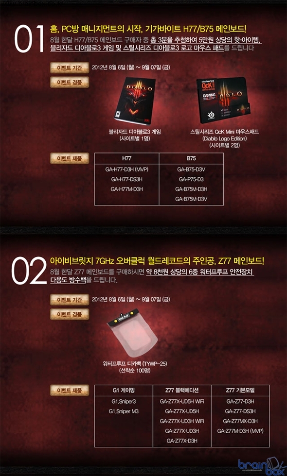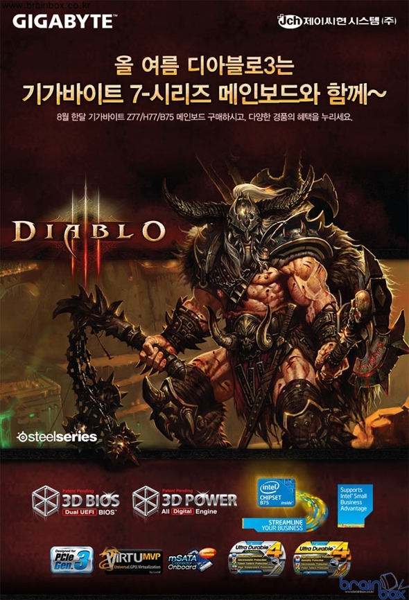 GIGABYTE Technology Co., LTD (이하 기가바이트)의 국내 공식 수입유통사인 제이씨현시스템(주)(대표:차현배)에서 8월 한달 간 기가바이트 Z77/H77/B75 메인보드를 구매한 고객에게 "디아블로3 정품 게임 및 스틸시리즈 디아블로3 게이밍 마우스패드, 그리고 6중 워터프루프 안전장치가 적용된 고급 방수팩을 경품으로 제공" 하는 이벤트를 진행한다.