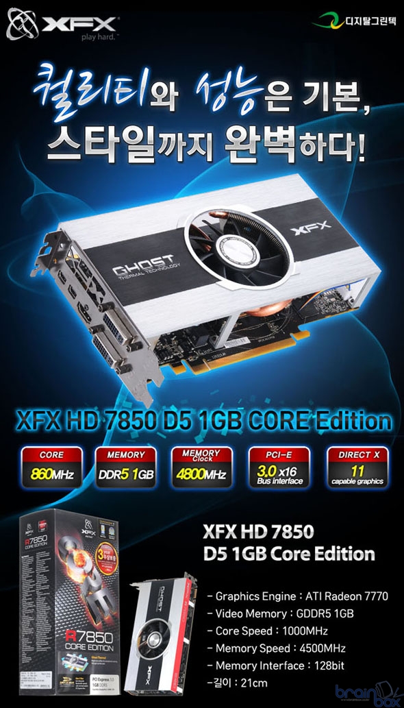 세계 최고의 품질을 자랑하는 XFX 그래픽카드의 국내 공식 디스트리뷰터인 디지탈그린텍㈜(대표 이주영)은 고성능 쿨링시스템을 탑재한 [XFX HD7850 D5 1GB Core Edition]을 출시한다.