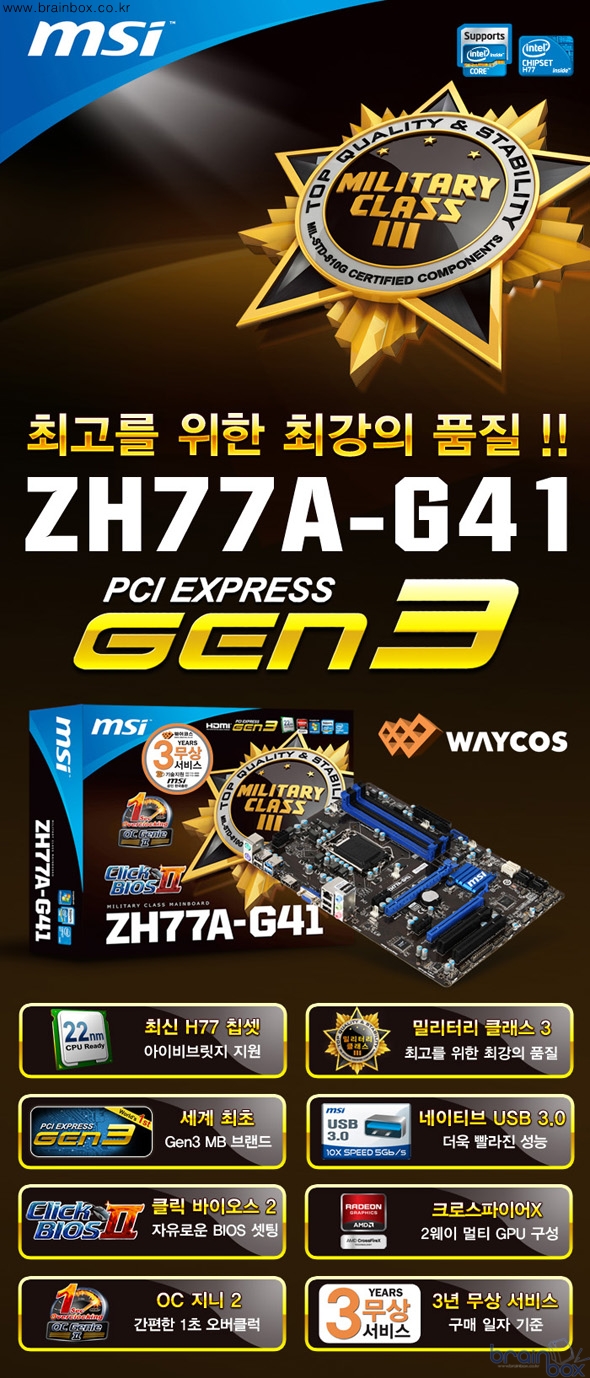 세계 정상급 토탈 IT 솔루션 제조사, MSI의 한국 공식 디스트리뷰터인 ㈜웨이코스(대표:고민종)가, 합리적인 가성비를 제공하는 “MSI ZH77A-G41 Gen3” 메인보드를 출시하였다. 22nm 제조공정, 차세대 아이비브릿지 CPU 지원