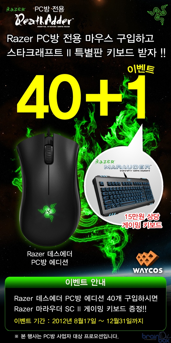 최상급 하이엔드 게이밍 기어 제조업체인 Razer의 한국 공식파트너 ㈜웨이코스(대표:고민종)가, Razer 데스에더 PC방 전용 마우스 구입 시 Razer 게이밍 키보드를 증정하는 특별 행사를 실시한다.