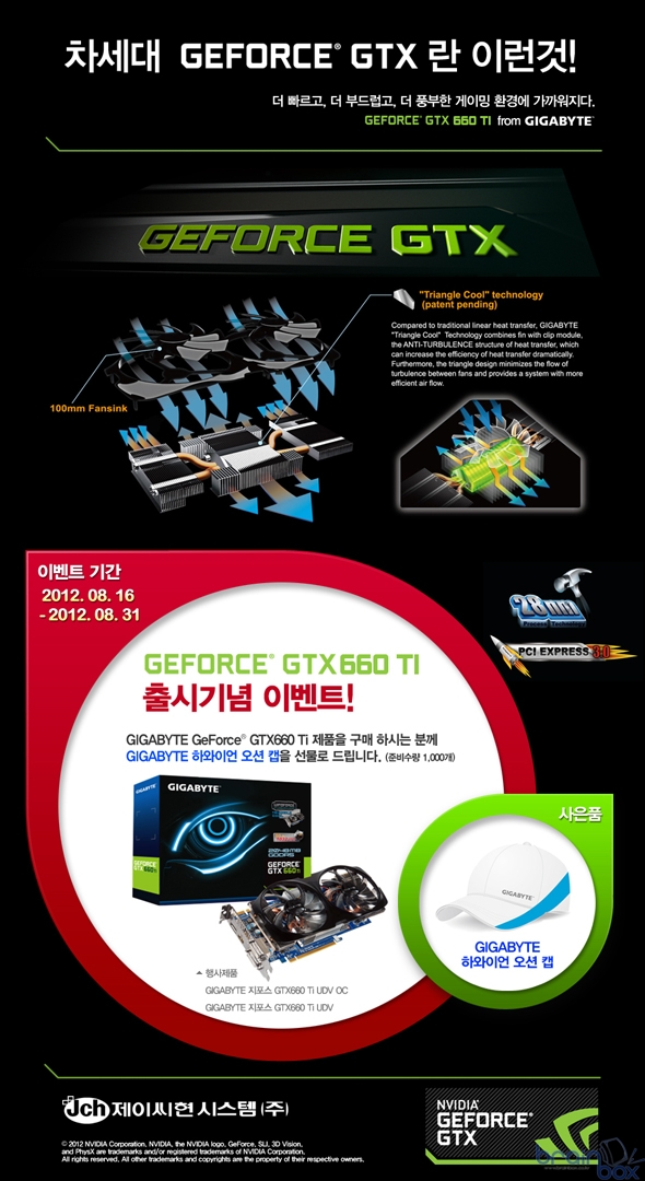 GIGABYTE Technology Co., LTD (이하 기가바이트)의 공식 공급원인 제이씨현시스템(주)(대표:차현배)에서는 GIGABYTE GeForce® GTX660 Ti 제품 출시에 발맞춰 다음과 같은 사은행사를 진행한다는 소식을 전했다. 이번 행사에는 GIGABYTE GeForce® GTX660 Ti 제품을 구매 하시는 선착순 1,000분께 COOLMAX 원단으로 제작된 세련된 디자인의 하와이언 오션 캡을 사은품으로 제공하고 있다. 탁월한 냉각능력으로 이미 그 성능이 입증된 GIGABYTE Triangle Cool™ 디자인과 WINDFORCE™ 쿨링팬이 탑재된 GIGABYTE 그래픽카드 구입 시, 기능적인 요소를 살린 세련된 디자인의 하와이언 오션 캡이 사은품으로 증정되어 제품 구입을 고려하신 소비자들께 좋은 기회가 될 것으로 예상 된다.