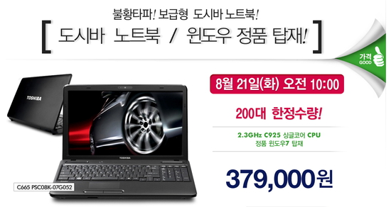 8월 21일 오전 10시부터 지마켓에서는 도시바의 보급형 노트북 C665 PSC08K-07G052를 379,000원 의 저렴한