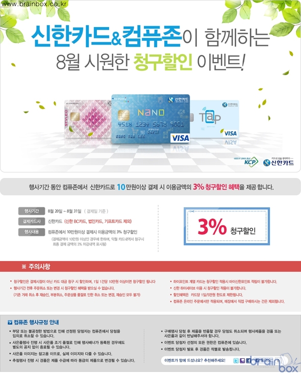 10만원 이상 구매 시 결제금액의 3% 청구할인 컴퓨터 전문 쇼핑몰 컴퓨존 (대표 노인호) 은 8월 31일까지 신한카드 고객을 위한 3% 청구할인 혜택을 진행한다고 밝혔다. 이번 행사는 신한카드로 10만원 이상 결제 시 3% 청구할인 혜택을 제공하며, 할인 한도액은 한 카드당 1일 최대 5만원까지 이다.