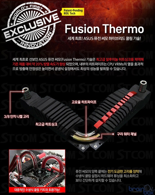 히트파이프 공냉 또는 수냉을 자유롭게 선택할 수 있는 퓨전 써모 기술 전통적으로 ASUS의 최상위 라인업인 ROG 시리즈에서는 새로운 ROG 제품이 출시될 때 마다 혁신적인 기술을 선보여 왔다. 이번에 새롭게 출시된 ASUS MAXIMUS V FORMULA 메인보드 역시 이러한 기대를 저버리지 않는 혁신적인 다양한 기술을 선보였다.