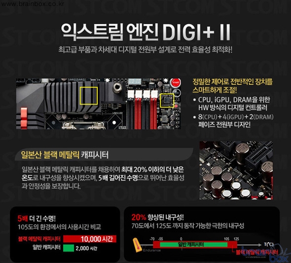 또한 메인보드의 핵심적인 부분인 전원 부에는 고성능 고급부품으로 명성이 높은 일본 니치콘 사의 블랙 메탈릭 캐피시터를 사용하였으며 3세대 칸칸 분리 스마트 디지털 전원 부를 채용하여 최적의 전원공급이 가능하도록 설계되었다.