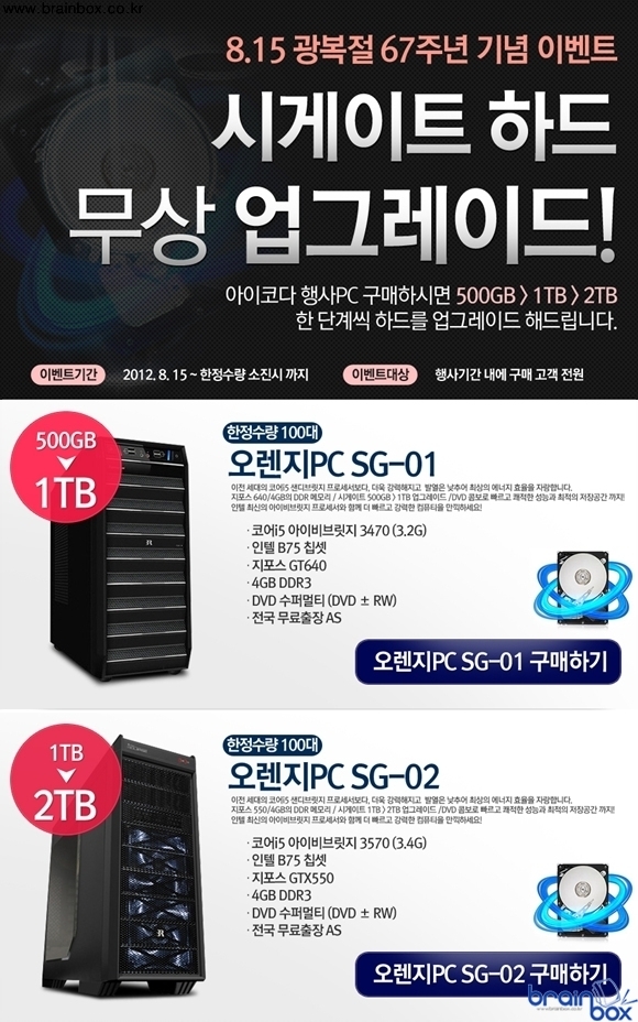 조립PC 전문 쇼핑몰 아이코다에서 67주년을 맞이한 8.15 광복절을 맞아 하드디스크 무상 업그레이드 이벤트를 실시중이다. 아이코다 행사에 해당되는 완제 조립PC를 구입하면 500GB는 1TB로, 1TB는 2TB로 기존 하드디스크 용량보다 2배 높은 모델이 출고된다.