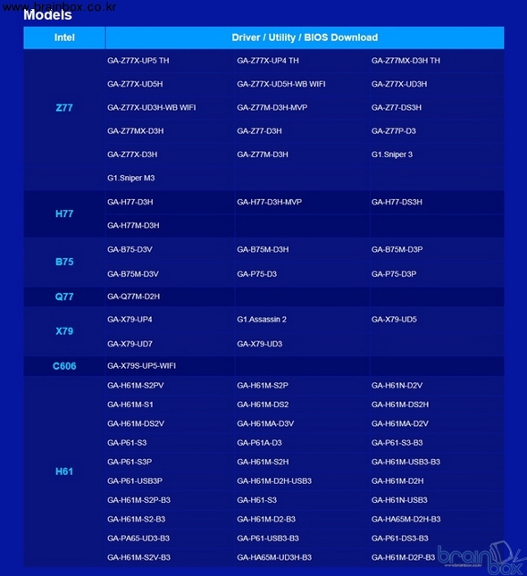 현재 기가바이트 글로벌 웹사이트(www.gigabyte.com)에는 인텔 7-시리즈 메인보드 (Z77/H77/B75/X79)와 H61시리즈 Windows 8 드라이버 업데이트가 완료 되어 다운로드가 가능하며 사용자의 사용 환경에 따라 Windows 8 32Bit/64Bit 전용 드라이버를 선택하여 다운로드가 가능하다.