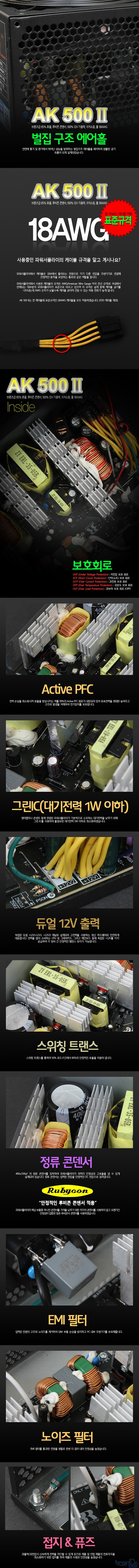 AK 500 II 파워서플라이를 출시합니다. AK 500 II 파워서플라이는 80PLUS 브론즈급의 85% 효율 (50% Load), 100% 12V 가용력, FSCC(팬 속도 최적화 회로) 적용으로 극저소음 등의 뛰어난 성능 및 일본 루비콘사 콘덴서 적용으로 안정성을 더욱 확보하였고, 가격 또한 일반 유저들이 접근하기 쉽도록 합리적 가격대를 형성한 국민 파워서플라이입니다. ![]() ![]() - 최고의 성능과 안정성, 정격 500W 출력 - ATX 12V v2.3, 듀얼 12V 출력 - 80PLUS 브론즈급의 85% 효율 (50% Load) - 안정적인 일본 루비콘사 콘덴서 적용 - 100% 12V 가용력 - 안정적인 12V 전압변동률 - FSCC(팬 속도 최적화 회로) 적용으로 극저소음 - 안정적인 18AWG 풀 케이블 적용 (FDD 케이블 제외) - 에너지 전력 효율 극대화 Active PFC 적용 - 고성능 PCI-E VGA 전용 커넥터 2개 제공 (SLI, Cross Fire) - 저전압, 단락, 과전류, 과부하, 과전압 보호회로 - 그린IC 적용으로 대기전력 1W 이하 - 국내 유저를 위한 220V 전용 설계 - 하단파워 케이스에 최적화된 선 길이 - 전 케이블 쉴딩처리 ![]() |