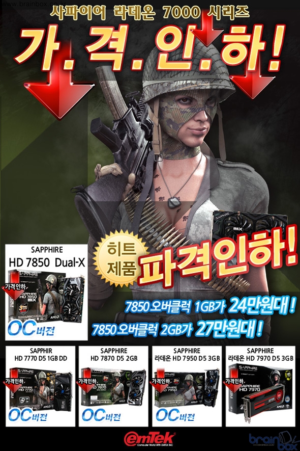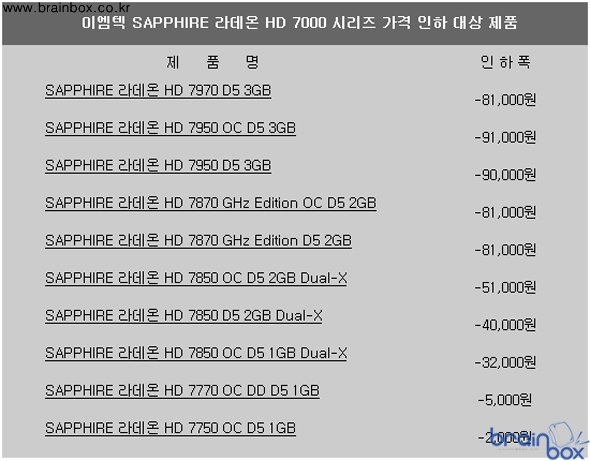 - 사파이어 라데온 HD 7000 시리즈 전 제품에 대해 최대 91,000원 인하. 사파이어 라데온 HD 7000 시리즈 그래픽카드를 더 저렴한 가격에 만날 수 있게 되었다. 국내 컴퓨터 그래픽카드 시장을 선도하고 있는 (주)이엠텍아이엔씨(대표:이덕수)는 AMD의 공식 가격 인하 정책에 발맞춰