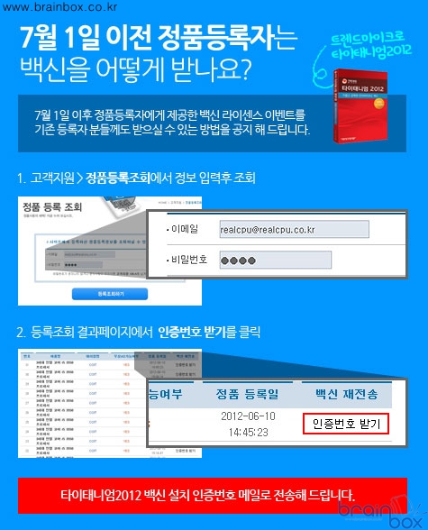 정품 등록 조회를 통해 백신 재전송 인증번호 받기를 통해 기존 정품 등록 사용자들도 다운 받을 수 있다. 해당 정품 인증은 리얼CPU(realcpu.co.kr)에서 확인할 수 있다. |