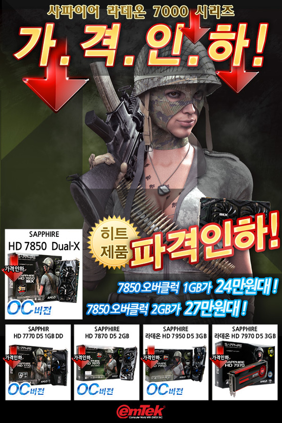 PC 주변기기 업체 이엠텍아이엔씨는 AMD의 공식 가격 인하 정책에 맞춰 'SAPPHIRE Radeon HD 7 000 시