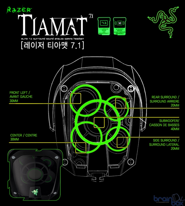 헤드셋 부문에서 전 세계 최초로 10개의 개별 드라이버를 내장하여 실제 7.1 채널 오디오 시스템과 동일한 사운드 환경을 헤드셋에 구현하였다. 기존의 헤드폰 제품들이 소프트웨어적인 7.1 채널을 지원하였다면 Razer TIAMAT은 하드웨어 True 7.1 채널을 갖춘 제품이다.