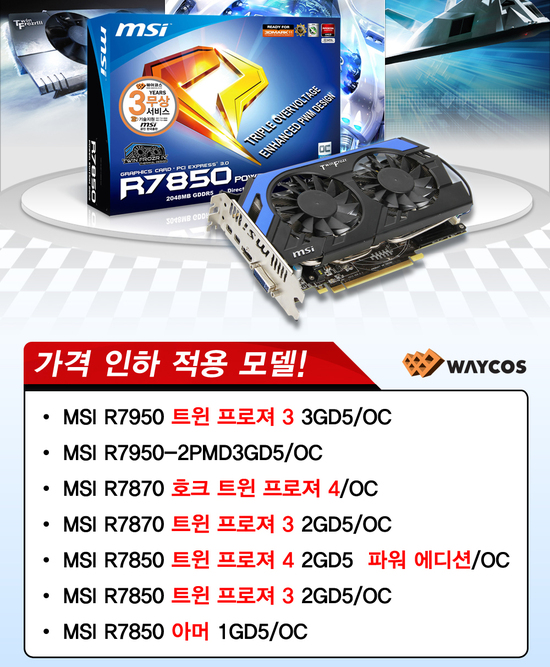 웨이코스(대표 고민종)는 MSI R7950 / R7870 / R7850 시리즈 그래픽카드의 가격을