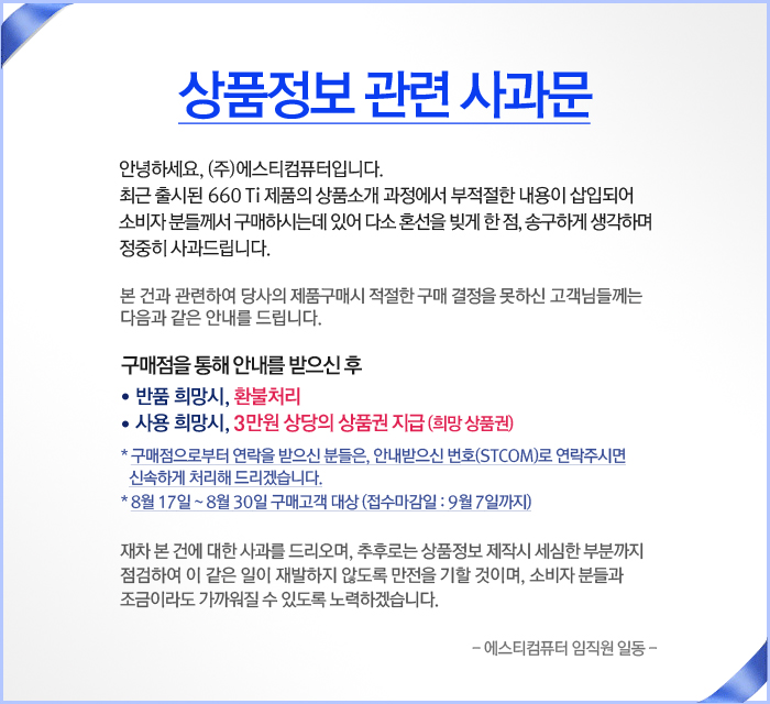 최근 출시된 GTX660TI 그래픽카드제품에서 상품정보와 관련되어 오기 및 오해의 소지가 있는 부분이 확인되어 관련부분을 수정진행 하고 있습니다.
