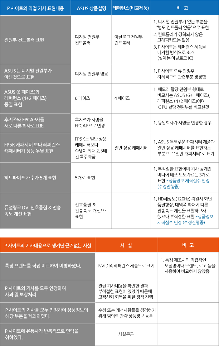 참조로 저희는 특정한 제조사 제품과 기능비교를 한 것이 아니라 NVIDIA 레퍼런스 제품을 기준으로 비 레퍼런스 설계제품인 ASUS 제품을 설명 드렸으며 특정 제조사 또는 유통 사 등의 명칭을 상품정보에 표기한 적이 없습니다.