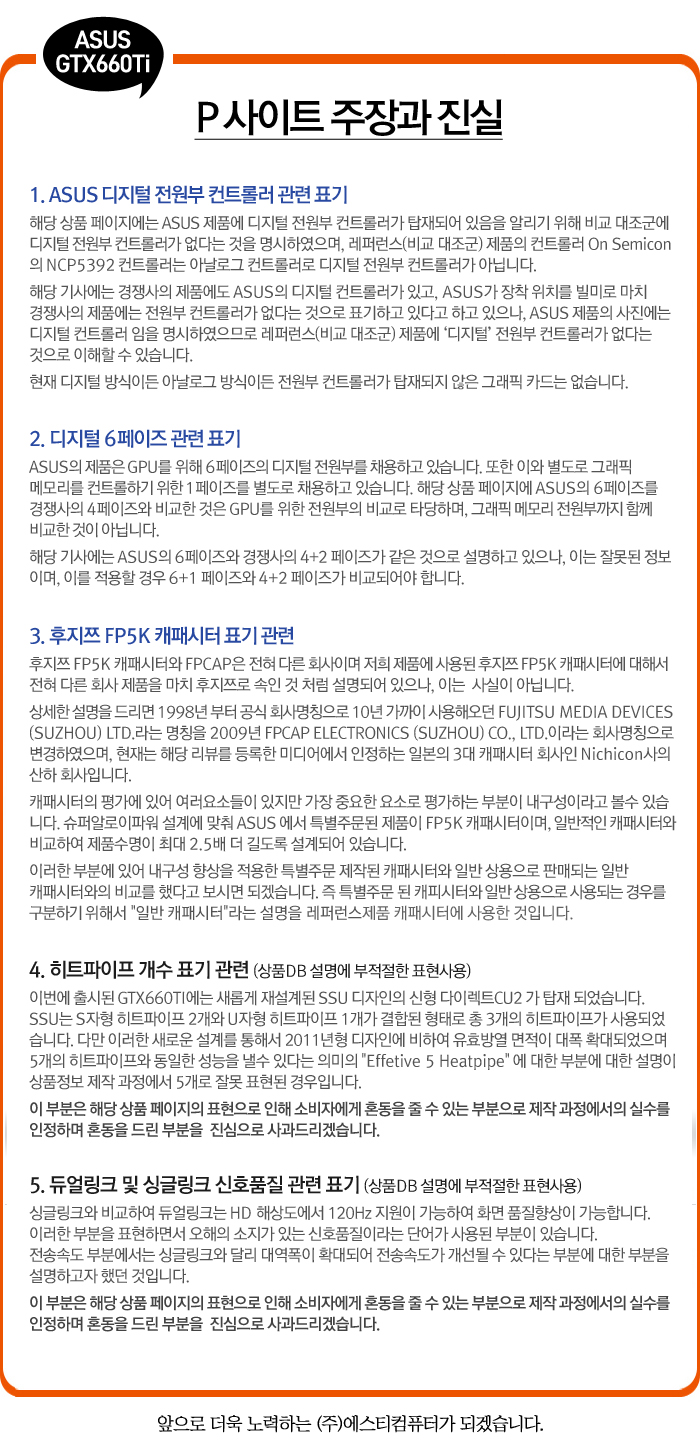 다만, GTX660TI 상품정보와 관련되어 문제점을 지적한 P사이트의 기술적인 내용부분에서 많은 부분 왜곡된 내용이 있어 이와 관련되어 저희의 입장과 또 정확한 정보를 추가로 제공해드리고자 합니다.