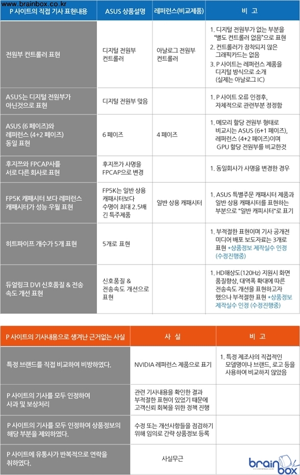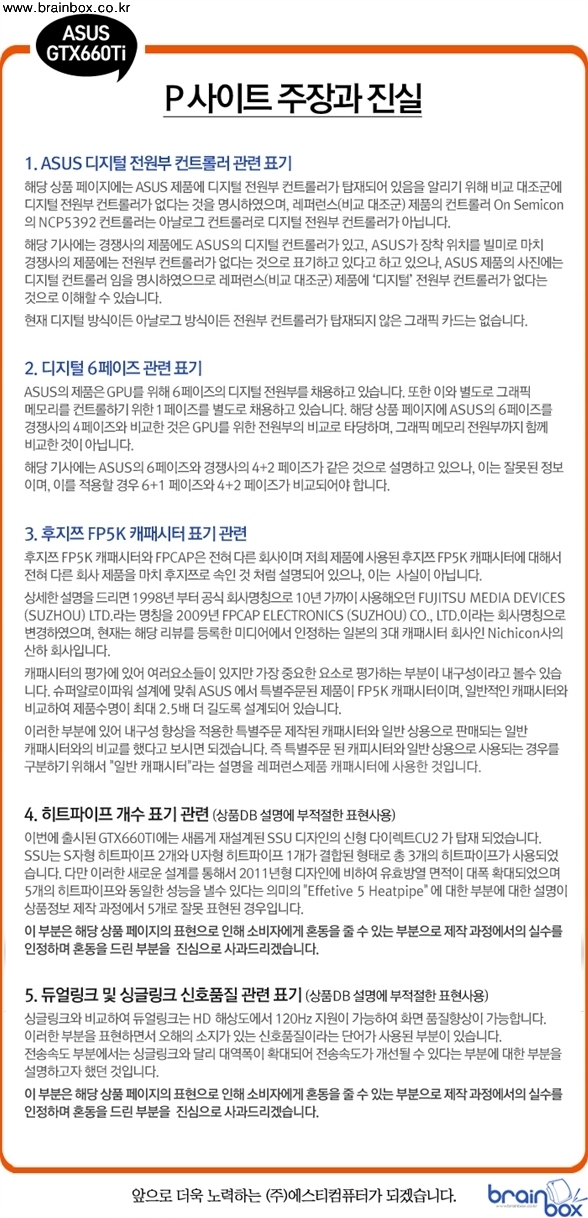 그래픽카드제품에서 상품정보와 관련되어 오기 및 오해의 소지가 있는 부분이 확인되어 관련부분을 수정진행 하고 있습니다.![]() 추후 상품 정보 제작 시는 보다 신중하고 오해의 소지가 없는 부분으로 상품정보를 제작할 수 있도록 최선을 다하겠으며 불편함을 겪으신 고객 분 들에게는 사과의 말씀을 드립니다. 다만, GTX660TI 상품정보와 관련되어 문제점을 지적한 P사이트의 기술적인 내용부분에서 많은 부분 왜곡된 내용이 있어 이와 관련되어 저희의 입장과 또 정확한 정보를 추가로 제공해드리고자 합니다. 참조로 저희는 특정한 제조사 제품과 기능비교를 한 것이 아니라 NVIDIA 레퍼런스 제품을 기준으로 비 레퍼런스 설계제품인 ASUS 제품을 설명 드렸으며 특정 제조사 또는 유통 사 등의 명칭을 상품정보에 표기한 적이 없습니다. 상품정보와 관련된 P사이트에서 제시한 상품정보 관련 정보와 상황에 대한 내용은 다음과 같습니다. ![]() ![]() |
