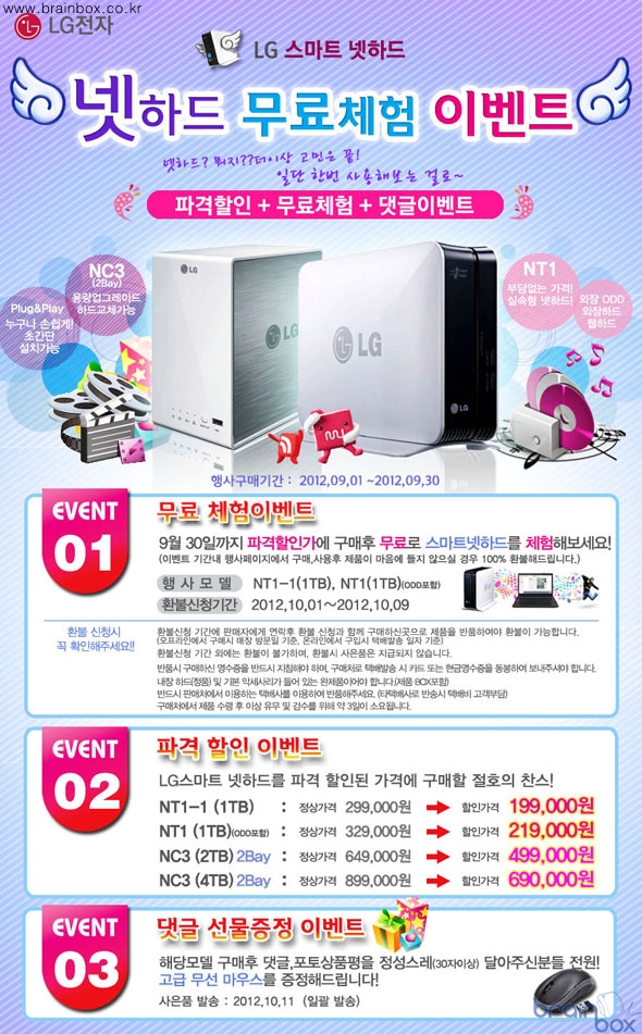스마트넷하드 무료체험은 NT1과 NT1-1에 한하며, 10월 1일부터 9일까지 환불 신청이 가능하다.가격 할인 및 무료체험과 함께 댓글 이벤트도 진행, 행사모델 구입 후 댓글 및 포토상품평을 남긴 모든 고객에게 고급 무선 마우스가 제공된다. 행사 제품인 NT1과 NT1-1은 스마트기기로 멀티미디어 콘텐츠를 다양하게 감상하려는 사용자를 위한 실속형 넷하드이며, NC3는 데이터 보유량이 많고 안정적으로 보관하려는 사용자에게 특히 적합한 제품이다. 이번 무료체험 이벤트에 대한 자세한 사항은 관련 웹사이트에서 확인할 수 있다. 컴매니아 측은 “넷하드에 대한 소비자들의 관심에 부응하고 구입의 부담을 덜어주고자 파격 할인 판매 및 무료체험, 댓글 이벤트의 삼단 프로모션을 준비했다”며 “이번 기회를 통해 좀 더 많은 소비자들이 넷하드의 편리함을 체감하길 바란다”고 밝혔다. |