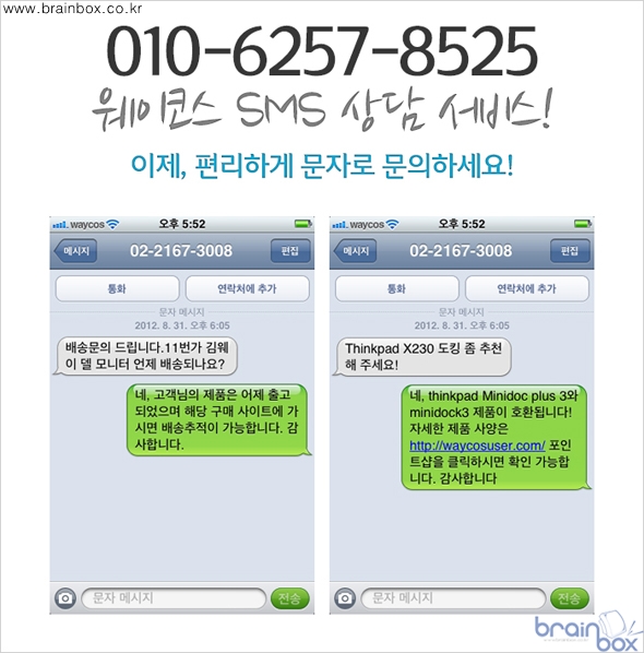 - 상품 정보, 호환성, 배송에 관련된 문의를 실시간으로 받자. 전세계 2위 PC회사 Lenovo 공식파트너 ㈜웨이코스(대표:고민종)는 9월3일부터 제품에 대한 문의, 호환성, 배송에 관련된 문의를 휴대폰 SMS 서비스를 통해 실시간으로 응답이 가능한 서비스를 시행한다. 기존의 시스템은 오픈마켓 게시판에 질문을 남긴 후 답변을 기다리는 형태였다. 또한 이번 SMS 서비스 시작은 비지니스 노트북의 표준인 ThinkPad 의 높은 성능과 안정성을 보다 빠르고 정확하게 전달하기 위한 ㈜웨이코스의 새로운 서비스이다. 오픈마켓(11번가,지마켓,옥션) 질문 게시판에 게시물 등록대신 지금 당장 SMS 또는 카카오톡으로모든 궁금증을 해결할 수 있다.