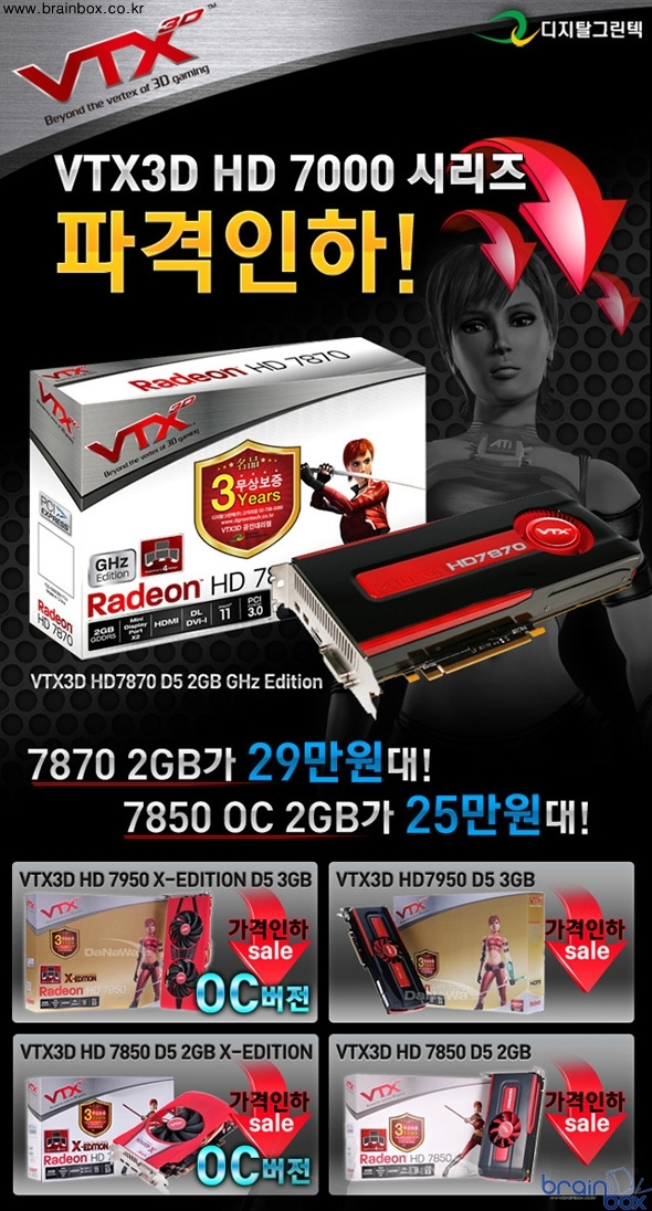 파격적인 가격정책으로 AMD그래픽시장을 선도하는 VTX3D의 국내 공식 디스트리뷰터인 디지탈그린텍㈜(대표 이주영)은 VTX3D HD7000시리즈 그래픽카드의 가격을 큰 폭으로 인하한다. 메인스트림 시장에서 소비전력 대비 성능으로 큰 인기를 얻고 있는 HD7870과 HD7850을 포함해, HD7950에 이르는 5개 모델을 대상으로 진행되는 이번 가격인하는 제품별로 최대 4만원이 넘는 파격적인 할인율로 고성능 AMD 그래픽카드를 보다 저렴하게 구입할 수 있는 좋은 기회가 될 전망이다.